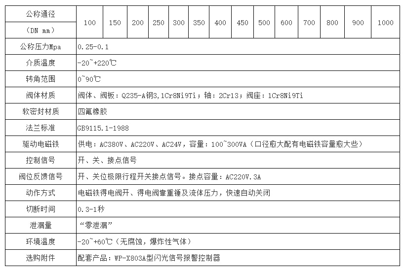 DMF-0.1由密封性能良好的防爆電磁機構(gòu)、鎖定機構(gòu)、蝶閥、重錘及重錘臂等部件組成。閥門開啟時,重錘臂處于豎立位置。電源接通,重鍾臂被鎖定機構(gòu)鎖定,管道正常輸氣。當管道內(nèi)介質(zhì)壓力低于規(guī)定值或系統(tǒng)出現(xiàn)異常須立即切斷介質(zhì)時,可通過相應的控制回路使電磁機構(gòu)斷電,解除鎖定。重鍾臂及閥板在重力的作用下,依順時針方向落下,閥門關閉。需要恢復供氣時,將重鍾臂連同重鍾按逆時針方向轉(zhuǎn)至升至似豎起位置,鎖定機構(gòu)復位,此時行程開關的接點閉合,電磁機構(gòu)得電,重鍾臂被鎖定,閥門又呈開啟狀態(tài)。電源系統(tǒng)意外斷電時,切斷閥會快速切斷。 通過控制電路與其中它的電氣設備進行聯(lián)鎖運行,切斷煤氣,以滿足生產(chǎn)系統(tǒng)的安全要求。功耗低。工作能耗一般為20W~40W,發(fā)熱量小,無噪聲,對于電力系統(tǒng)瞬間斷電(<0.5秒)有較強的抗干擾能力。